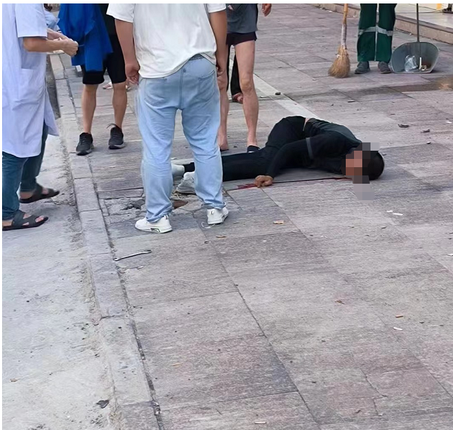 一名穿黑衣的男子趴在地上,脸下、身下都有一摊清晰的血迹,让人担心不已。